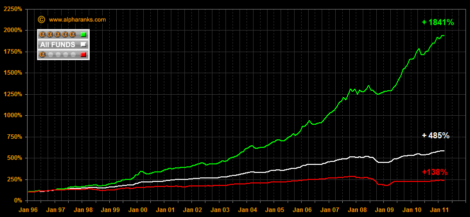 *Based on a universe of approximately 5000 funds.  Out-Of-Sample Indices, are constructed by investing equally in all Hedge-Funds belonging to one class of ranking  (for example 5 Alphas) in the month that follows the ranking. The "All Funds" Index,  is constructed by investing equally in all Hedge-Funds.                      www.alpharanks.com